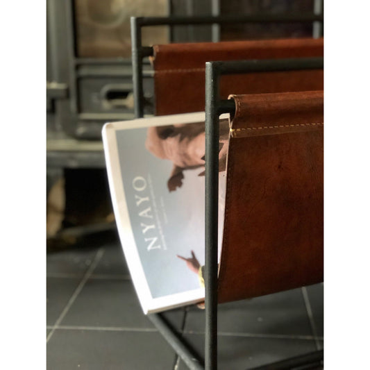 The Vinny Magazine Rack, Red Leather Sling, Metal Frame, 50cm Wide, 35cm High
